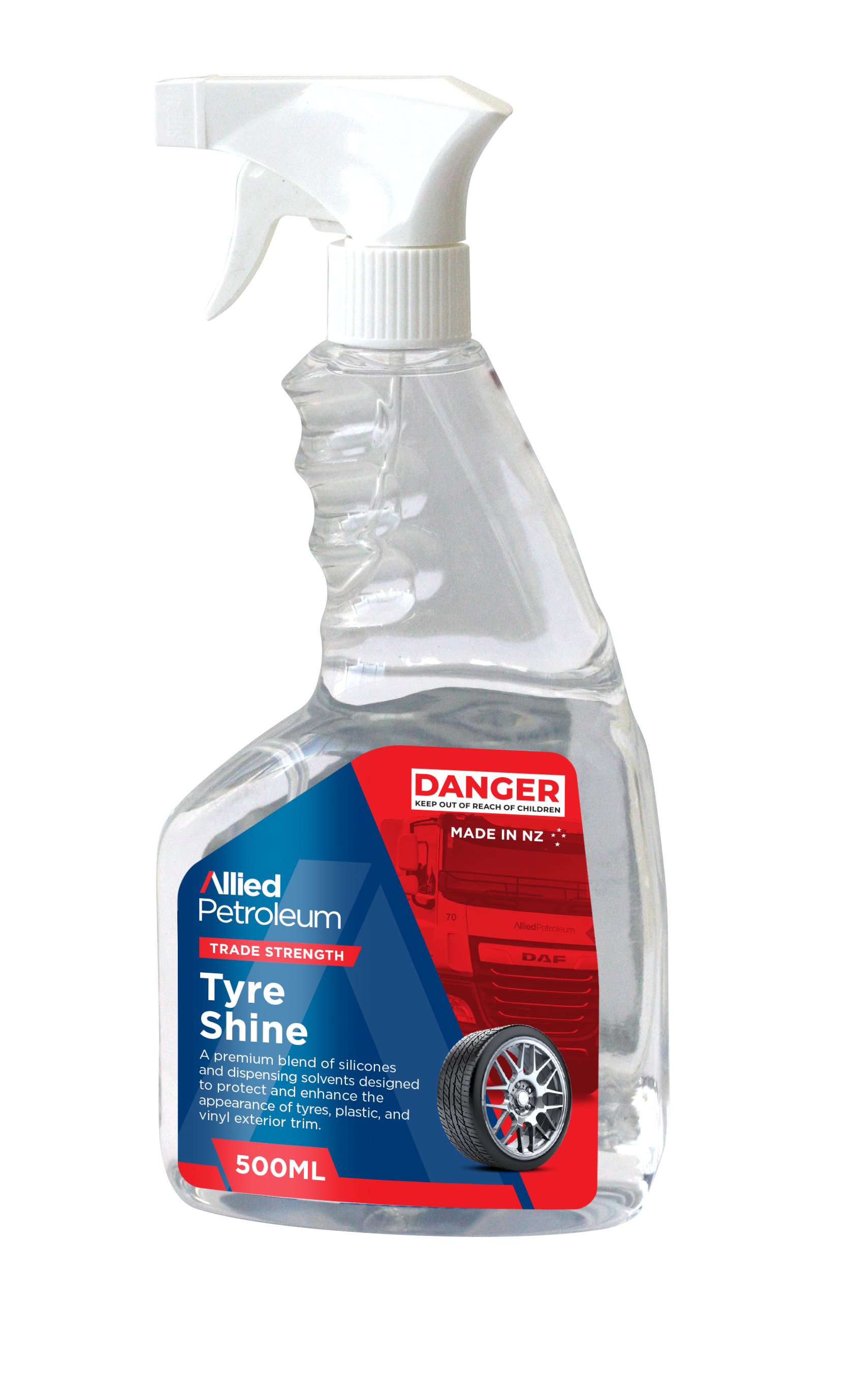 Allied Tyre Shine protects and enhances tyres, plastic trim, and vinyl surfaces with a premium silicone blend for a professional finish.